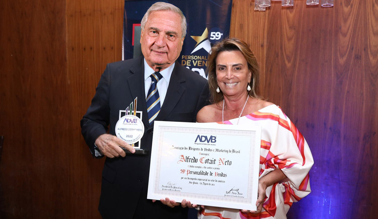 Presidente da Federação das Associações Comerciais do Estado de São Paulo, da Confederação das Associações Comerciais do Brasil e da Associação Comercial de São Paulo (2019 -2023) recebe o título de Personalidade de Vendas ADVB. Na foto, com a esposa Ana Claudia Badra Cotait.