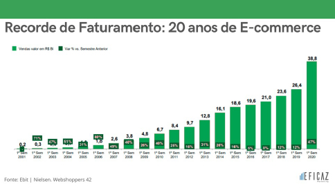 Do mercado total de 13,1% que o Comercio desempenhou em 2020 no PIB do pais, ou próximo a 1170 BiR$, o E-Commerce ocupava em 2020 cerca de 39 BiR$ ou seja próximo a 3,5% já em 2023 atingiu 186 BiR$ ou seja próximo a 16%, mas com tendencias de alta exponencial devendo atingir próximo a 40% em 2030. Os números são impressionantes por se tratando de transações voltadas a B2C e de Tickets baixos.