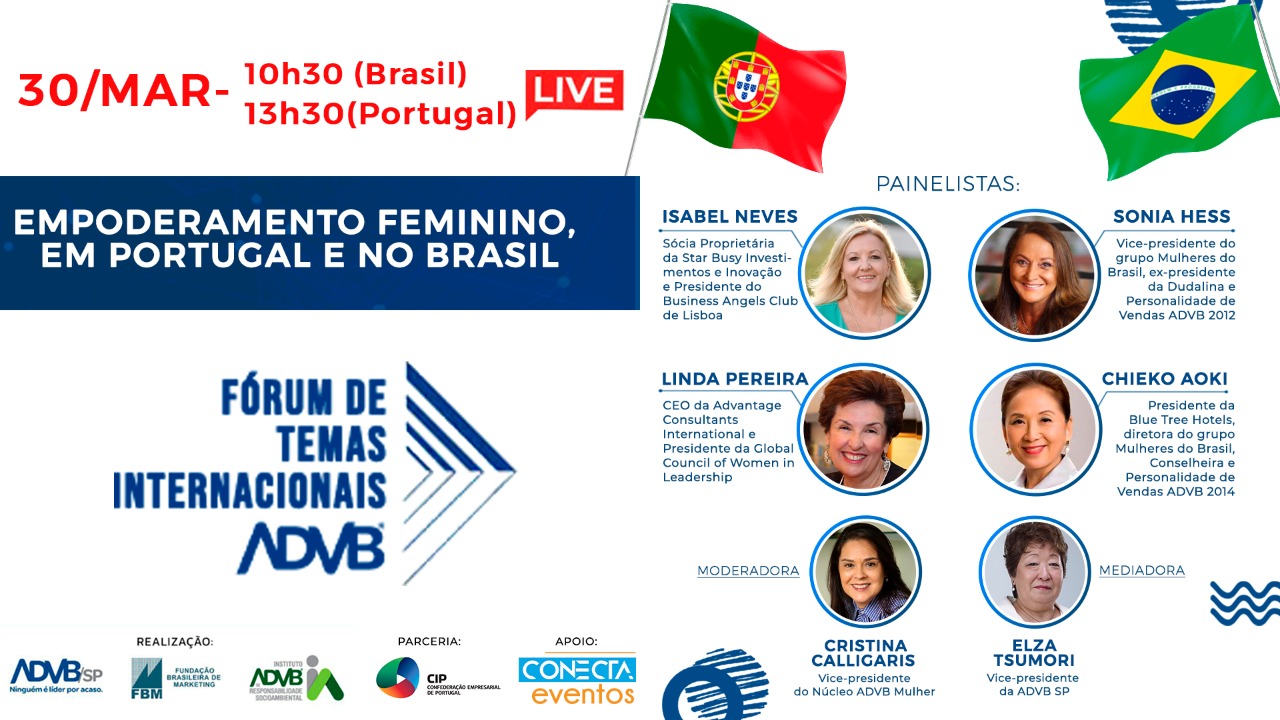 Seis mulheres habituadas ao protagonismo nos seus campos de atuação compartilham vivências, conhecimento e experiência na Live agendada para 30/03/2021. Será mais uma edição do sempre esperado Fórum de Temas Internacionais da ADVB-SP. Horário: a partir das 10h30, com transmissão pelo canal do Youtube ADVBtv: https://youtu.be/PEda95KB8T4.
