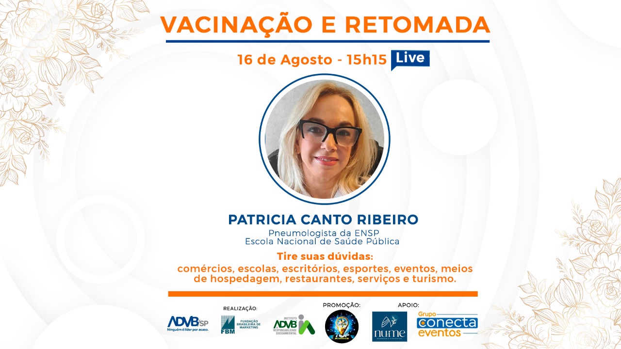 No próximo dia 16 de agosto, segunda-feira, às 15h15, Dra. Patrícia Canto Ribeiro, pneumologista do Centro de Estudos de Saúde do Trabalhador e Ecologia Humana – FIOCRUZ, desde 2008, conduzirá o próximo Fórum de Temas Nacionais ADVB – Vacinação e Retomada. LIVE promete esclarecer dúvidas da audiência em relação às atividades liberadas pela vacinação.