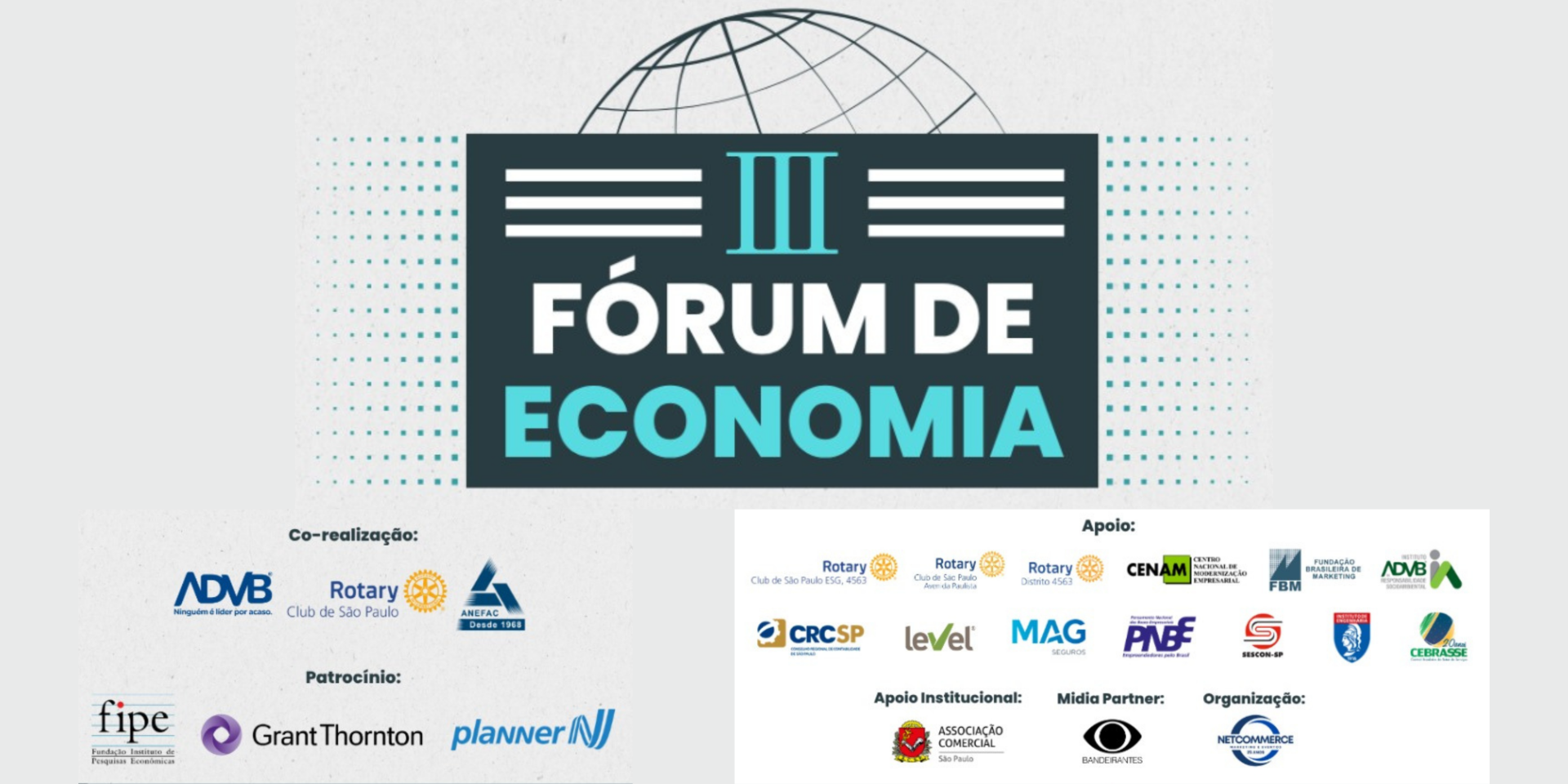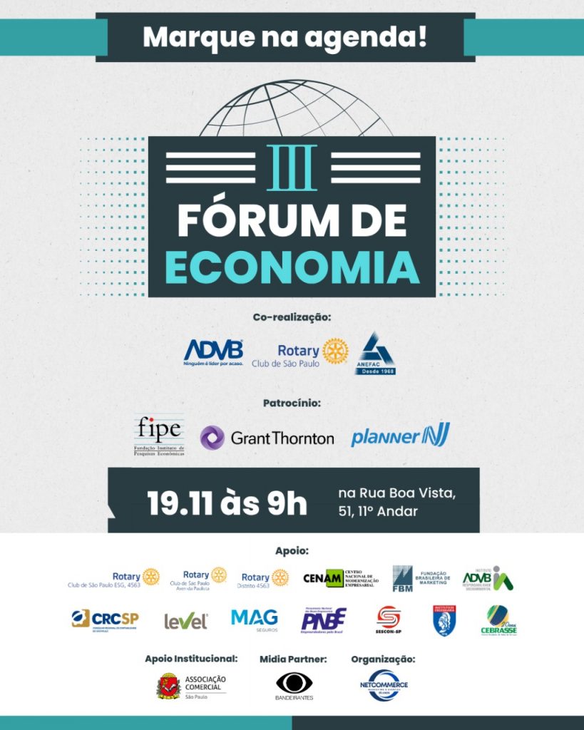 O III Fórum de Economia é uma co-realização da ADVB/SP, do Rotary Club de São Paulo e da ANEFAC, com patrocínio da FIPE, Planner Investimentos e Grant Thornton Brasil.