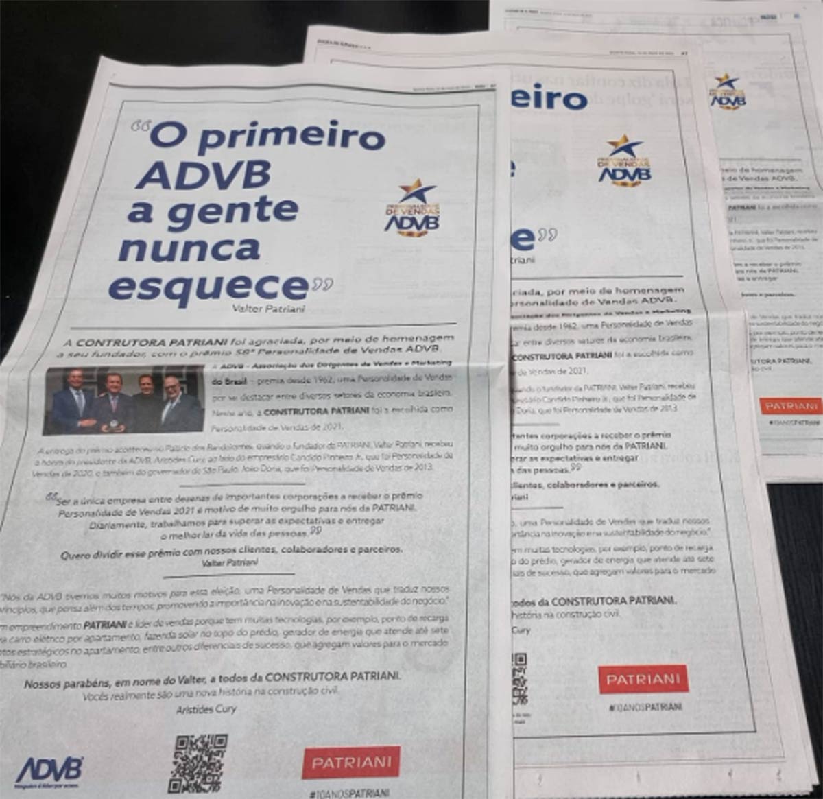 Em tributo à distinção conferida a Valter Patriani, veio a público campanha publicitária cujo mote é frase textual do homenageado: “O primeiro ADVB a gente nunca esquece”. O presidente da ADVB-SP, Aristides de La Plata Cury, no conteúdo da campanha, salienta: “Nós, da ADVB, tivemos muitos motivos para essa eleição; uma Personalidade de Vendas que traduz nossos princípios, que pensa além dos tempos, promovendo a importância na inovação e na sustentabilidade do negócio”.