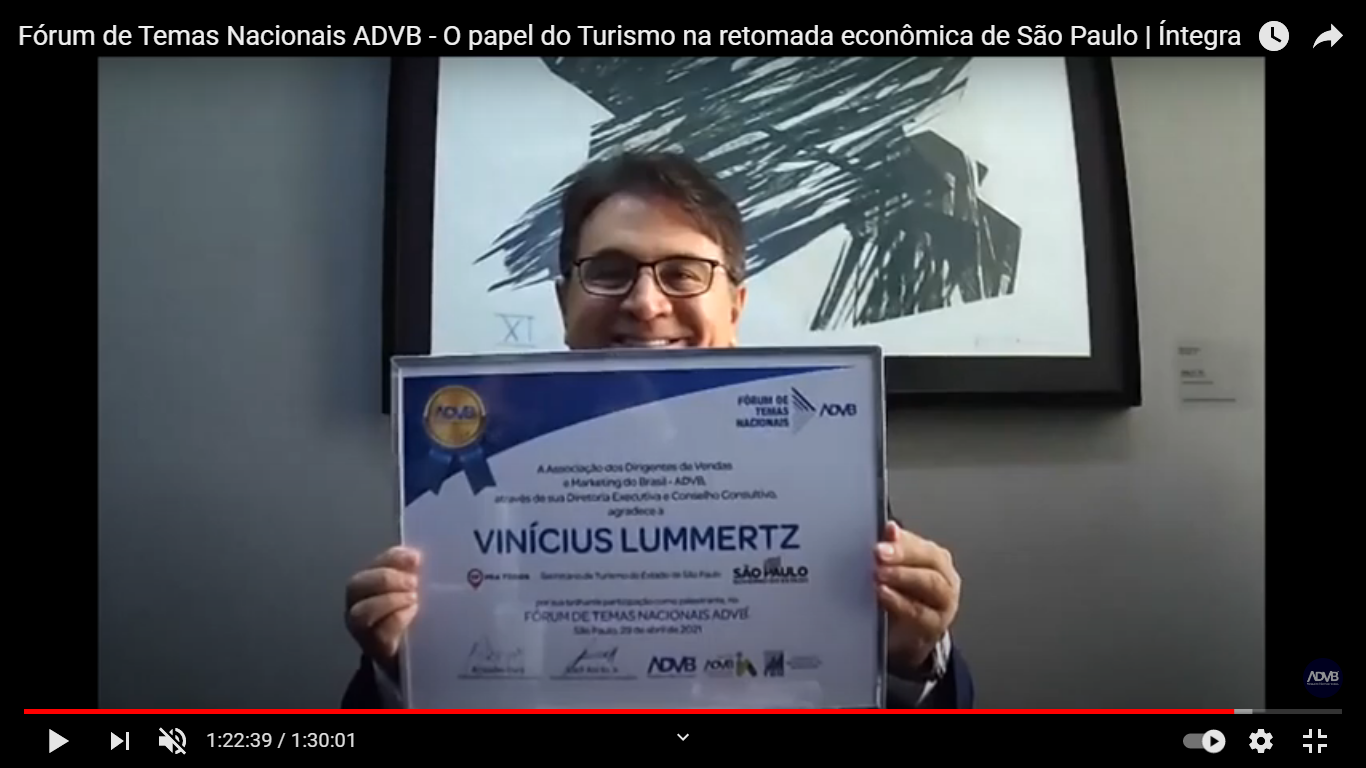 Em mais uma edição online do Fórum de Temas Nacionais FTN ADVB, na manhã de 29/04/2021, coube ao secretário de Turismo, Vinicius Lummertz, conduzir palestra intitulada ‘O papel do Turismo na retomada econômica do Estado de São Paulo’. Na moderação, o presidente executivo do SPCVB – Visite São Paulo, Toni Sando. Evento contou com audiência de 927 pessoas, entre dirigentes públicos e lideranças municipais, profissionais de turismo, de vendas e marketing, associados da ADVB SP.
